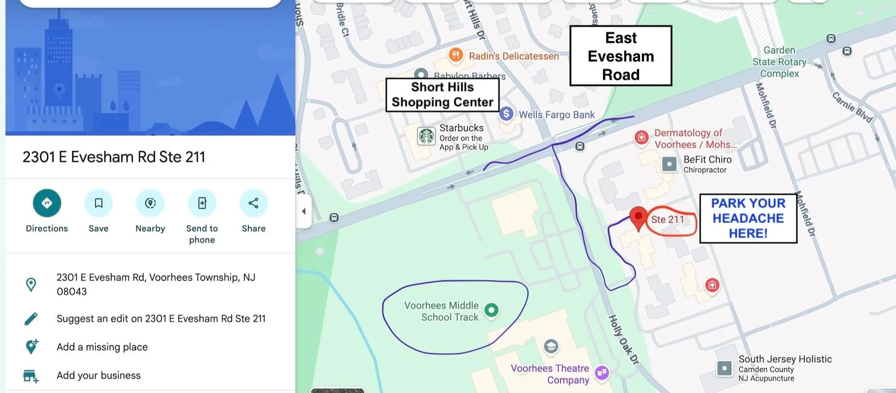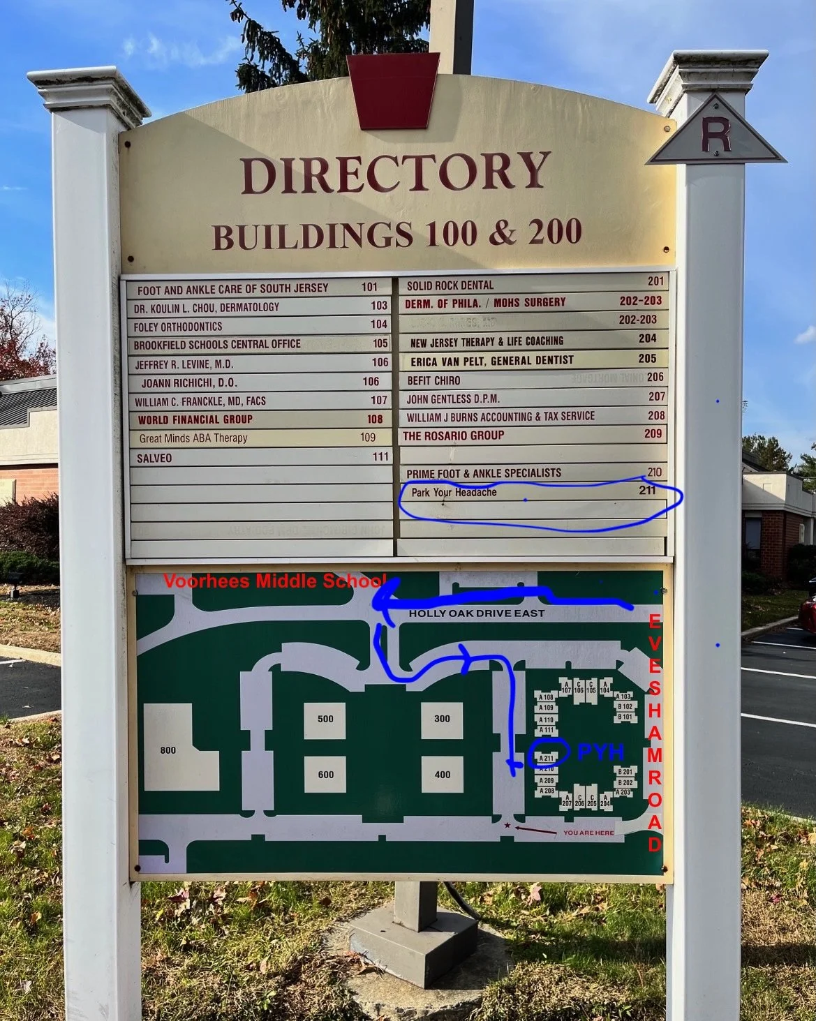 Coming in from east on Evesham Road, continue then take a left at and onto Holly Oak Road, when you see the sign for Voorhees Middle School, take a left into the Pavilions of Voorhees, make an immediate left, then make an immediate right. Park Your Headache will be on your left, a corner medical office space Suite 211, part of building 200.